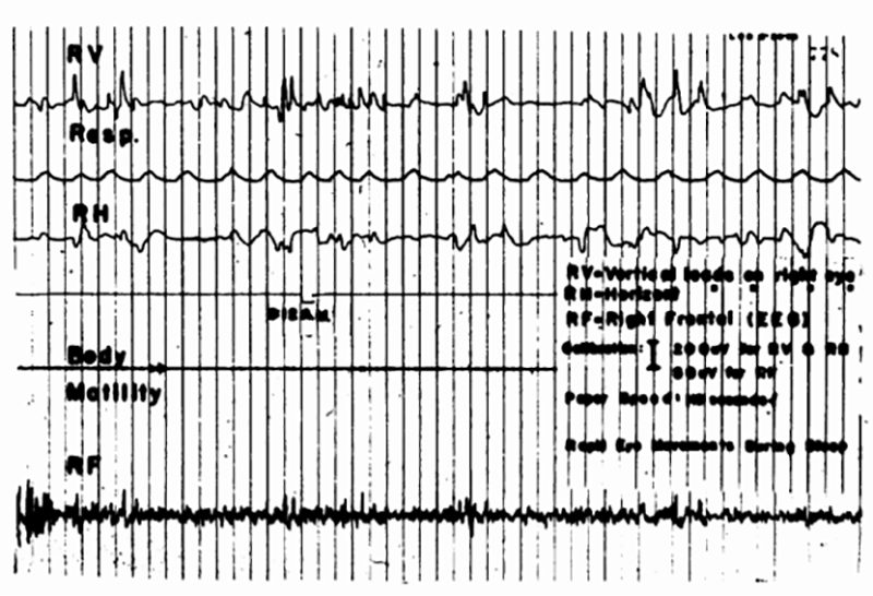 (曲線自上而下 --- RV:右側垂直方向眼電;Resp:呼吸曲線;RH:右側水平方向眼電;Body Motility:身體運動;RF:右側前額葉腦電)
