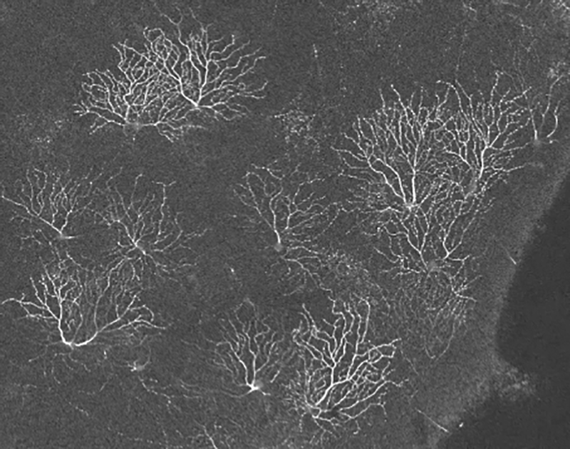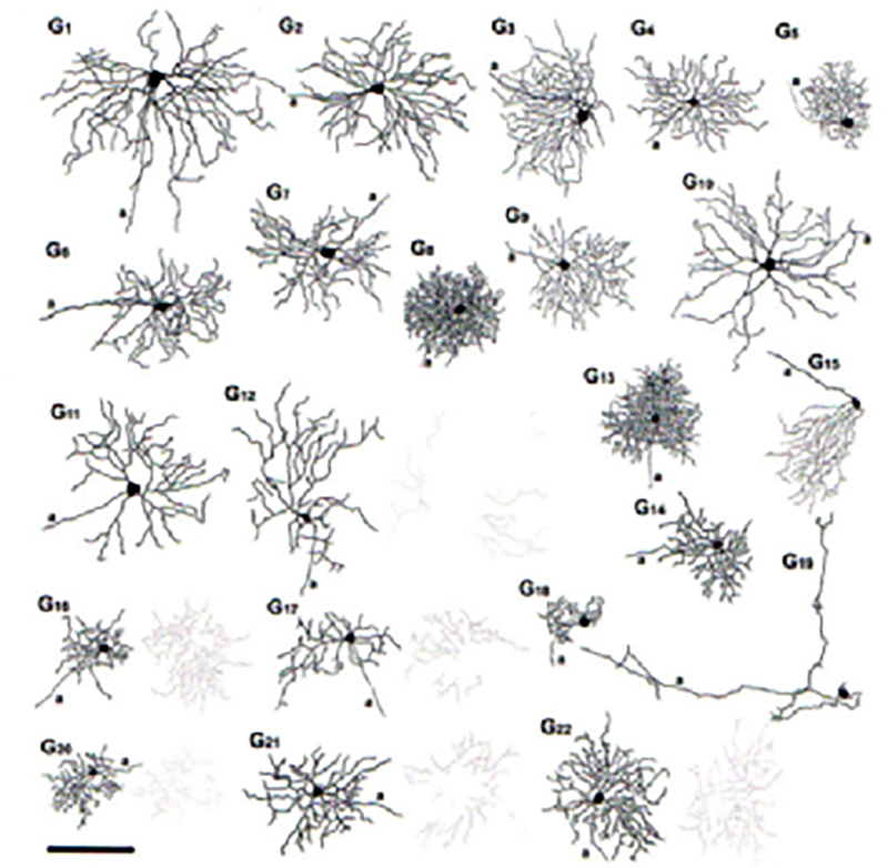 其實(shí)不管是迎面撲來(lái)的貓,還是從天上飛下來(lái)的貓頭鷹,小鼠看到的只是一個(gè)向它逼近的黑影。研究員們發(fā)現(xiàn),只需要給小鼠看這么一個(gè)由小變大的黑色的圓,小鼠就會(huì)觸發(fā)逃跑和僵直反應(yīng)。而阿爾法細(xì)胞正好可以看到這種逼近的黑影的刺激。當(dāng)記錄阿爾法細(xì)胞,并提供逼近黑影的刺激供其觀看時(shí),研究員們發(fā)現(xiàn),阿爾法細(xì)胞會(huì)對(duì)逼近黑影產(chǎn)生反應(yīng),而且反應(yīng)強(qiáng)度可以對(duì)逼近視覺(jué)刺激的大小進(jìn)行調(diào)整,也就是說(shuō),小鼠能夠通過(guò)阿爾法細(xì)胞對(duì)捕食者的距離進(jìn)行判斷。阿爾法細(xì)胞的樹(shù)突(接收信號(hào)的結(jié)構(gòu))就像一個(gè)個(gè)面向太空的雷達(dá),長(zhǎng)長(zhǎng)的天線組成一個(gè)寬大的網(wǎng)。整個(gè)視網(wǎng)膜中有上千個(gè)這種細(xì)胞,它們互相重疊,不漏過(guò)視野里的每個(gè)點(diǎn)。這類(lèi)細(xì)胞還有一根粗大的軸突(傳出信號(hào)的結(jié)構(gòu)),軸突能夠像電纜一樣傳輸信號(hào)。這個(gè)“電纜”的特殊之處是有絕緣外套包裹,相較于其他細(xì)胞,它能夠更快地將信號(hào)傳導(dǎo)至腦中。
