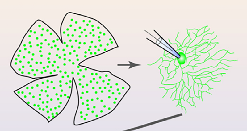 雖然研究員們?cè)缫巡碌搅诉@類(lèi)細(xì)胞,但是這類(lèi)細(xì)胞零散地分布在視網(wǎng)膜中,每次研究員們只能隨機(jī)抓取一個(gè)細(xì)胞,能不能碰見(jiàn)下一個(gè),完全靠運(yùn)氣。得益于深入的基因研究,研究員們找到了在阿爾法細(xì)胞中特異表達(dá)的一個(gè)基因。此后,研究員們培育了轉(zhuǎn)基因小鼠,通過(guò)這種方法,他們可以將該細(xì)胞點(diǎn)亮,讓它在眾多的細(xì)胞中脫穎而出。而且可以通過(guò)特殊的方法來(lái)控制這群細(xì)胞,進(jìn)而證明這類(lèi)細(xì)胞的功能是什么。