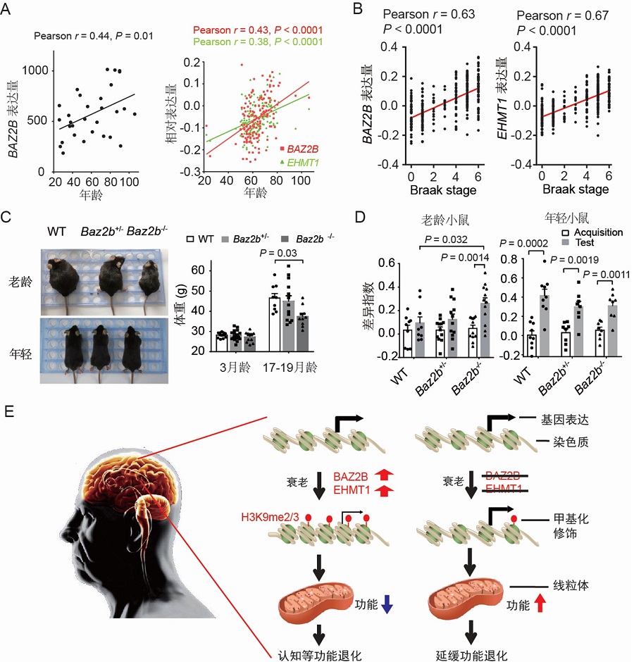 圖注(A)BAZ2B和EHMT1在衰老大腦中的表達水平(來自兩個不同數據庫的結果)。(B)BAZ2B和EHMT1的表達量與阿爾茲海默氏癥病情呈正相關。(C)年輕和年老的WT、Baz2b+/-Baz2b-/-小鼠的體重。(D)年輕和年老的野生型(WT), Baz2b雜合(Baz2b+/-), Baz2b敲除(Baz2b-/-)小鼠在新位置識別測試中的位置識別能力。(E)表觀遺傳因子調節線粒體功能和衰老工作模式圖。
