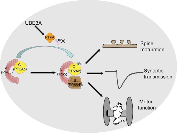 2019年6月3日,《美國(guó)科學(xué)院院刊》在線發(fā)表了一篇題為《UBE3A介導(dǎo)PTPA的泛素化降解調(diào)控PP2A活性和樹(shù)突棘形態(tài)》的研究論文,該研究由中國(guó)科學(xué)院腦科學(xué)與智能技術(shù)卓越創(chuàng)新中心(神經(jīng)科學(xué)研究所)、上海腦科學(xué)與類腦研究中心、神經(jīng)科學(xué)國(guó)家重點(diǎn)實(shí)驗(yàn)室熊志奇研究組與華東師范大學(xué)廖魯劍教授研究組合作完成。該研究描述了泛素連接酶UBE3A通過(guò)調(diào)控磷酸酶PP2A的激活因子PTPA的泛素化降解,進(jìn)而影響磷酸酶活性的一條信號(hào)通路,并且揭示了該信號(hào)通路的異常是介導(dǎo)UBE3A缺失導(dǎo)致的天使綜合征的新的病理機(jī)制,為治療該疾病提供了新的藥物靶點(diǎn)。