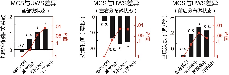 圖3、三種腦電微狀態參數的最小意識狀態與無反應覺醒綜合征組間差異隨任務中語言層級的提升而加大
