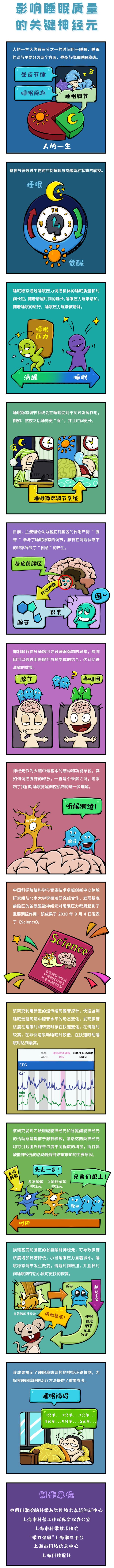 2020年9月4日,《Science》雜志發表了題為《Regulation of sleep homeostasis mediator adenosine by basal forebrain glutamatergic neurons》的研究論文,該研究由中國科學院腦科學與智能技術卓越創新中心(神經科學研究所)、上海腦科學與類腦研究中心、神經科學國家重點實驗室徐敏研究組與北京大學生命科學學院、北大-清華生命科學聯合中心、北京大學麥戈文腦科學研究所李毓龍研究組合作完成。該項研究利用新型遺傳編碼的腺苷探針,發現基底前腦區的谷氨酸能神經元對于睡眠壓力的積累起著重要的調控作用,進一步揭示了睡眠穩態調控的神經環路機制,為探索睡眠障礙的治療方法提供了重要參考。