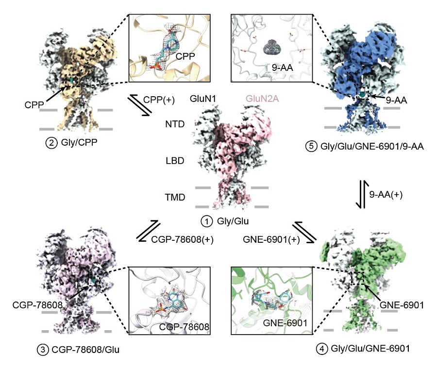 圖1 | 冷凍電鏡解析不同狀態(tài)下人源GluN1-GluN2A NMDA受體
