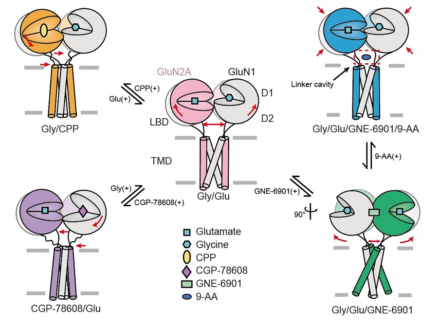 NMDA受體作為一類重要的興奮性離子型谷氨酸受體,在神經(jīng)系統(tǒng)發(fā)育形成與突觸可塑性中發(fā)揮重要功能。NMDA受體通常由兩個結(jié)合甘氨酸的必需亞基GluN1和兩個結(jié)合谷氨酸的可變GluN2亞基(2A-2D)組成異源四聚體離子通道蛋白。其功能異常與中樞神經(jīng)系統(tǒng)和精神疾病(如抑郁癥、精神分裂癥、帕金森病和阿爾茲海默癥等)有密切的關(guān)聯(lián)性。這些神經(jīng)和精神疾病給患者及病人家屬帶來極大的痛苦,是亟需解決的重要臨床難題。因此,深入研究NMDA受體在生理狀態(tài)下的構(gòu)象與功能,并揭示全新的小分子結(jié)合位點,對于靶向NMDA受體功能異常的新藥研發(fā)是至關(guān)重要的。