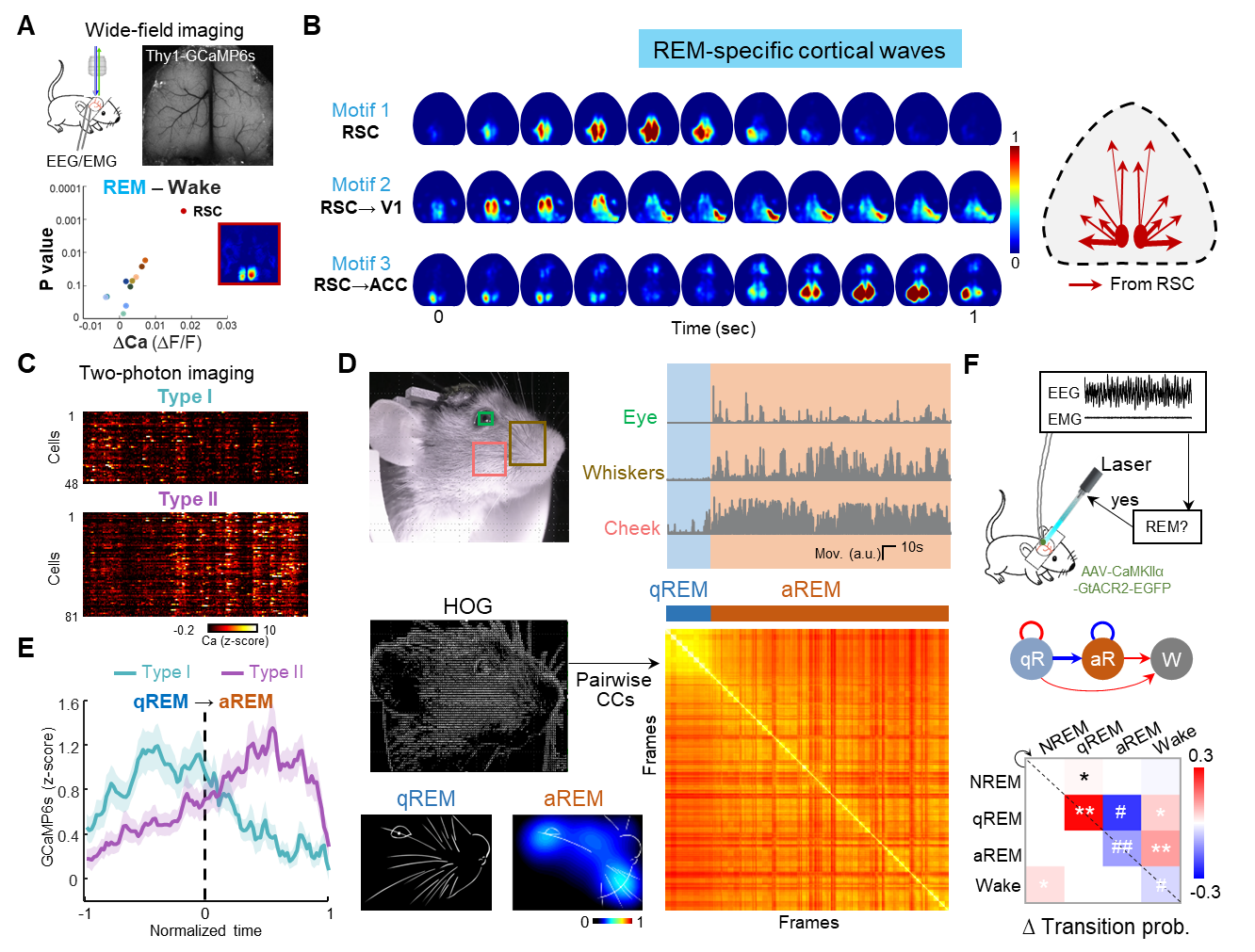 圖注(A)雙通道寬場熒光成像示意圖(上);十一個功能模塊REM睡眠與清醒狀態活動差異(下)。(BREM睡眠的三種主要鈣波(左);REM睡眠中從RSC起始的鈣波活動示意圖,其中箭頭粗細代表RSC與目標區域間鈣活動的格蘭杰因果關系值。(C)通過雙光子成像得到RSC L2/3神經元活動并通過k-means聚類分成兩種類型,圖為一段REM睡眠中兩類RSC神經元鈣活動情況。(D)通過紅外相機采集到REM睡眠中小鼠的面部視頻(左上),其中小鼠眼睛、胡須和咀嚼肌位置的臉頰在REM睡眠后期有豐富的運動(右上)。下:利用HOG算法劃分REM睡眠亞狀態---qREM aREM。(ERSC L2/3兩類神經元在REM睡眠亞狀態qREMaREM 過程中的鈣信號變化(數據處理將qREMaREM長度標準化到1)。(F)閉環光遺傳實驗示意圖(上)。在REM睡眠中特異性抑制RSC興奮性神經元阻斷了qREMaREM的轉換以及aREM的維持(下)。