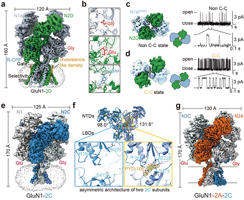 2. 含有GluN2DGluN2C受體的三維結構門控機制和藥理學特性aGluN1-N2D受體的三維結構b, 甘氨酸、谷氨酸和競爭性抑制劑R-CPP在其結合口袋中的電子密度c, d, GluN1E698C-N2D突變型受體在二硫鍵交聯和非交聯狀態下的三維構象和單通道性質。e, GluN1-N2C受體的三維結構。f, GluN1-N2C受體的非對稱性構象及選擇性變構抑制劑PYD-106的結合口袋。g, GluN1-N2A-N2C受體的組裝模式和拓撲結構。