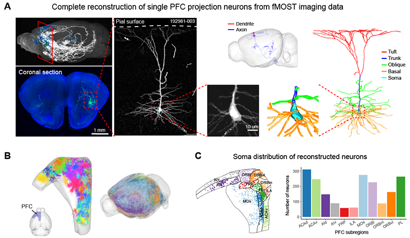 圖1 神經元樹突和軸突形態的完整重構。(A)fMOST原始圖像和單神經元重構結果。(B)重構的前額葉皮層神經元(n=1920)的樹突和軸突。(C)重構神經元胞體在前額葉皮層亞區的空間分布。