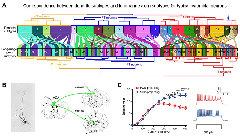 接著,研究人員進一步研究了神經元樹突形態和軸突投射的關系,發現樹突越復雜的神經元軸突投射也越廣泛,并且由樹突形態定義的神經元亞型與由軸突投射定義的神經元亞型之間有很強的對應關系,說明神經元在接收信號和傳遞信號的模式上具有一致性(圖3A)。在前額葉皮層PL-ACA區域存在兩類軸突投射不同的PT神經元(SCm投射和PCG投射),而它們的樹突形態也存在顯著差異。同時,通過逆行標記和膜片鉗記錄,研究人員發現這兩類神經元在電生理性質上也存在著顯著差異(圖3B),說明樹突形態和軸突投射的變化伴隨著神經元在功能上的變化。