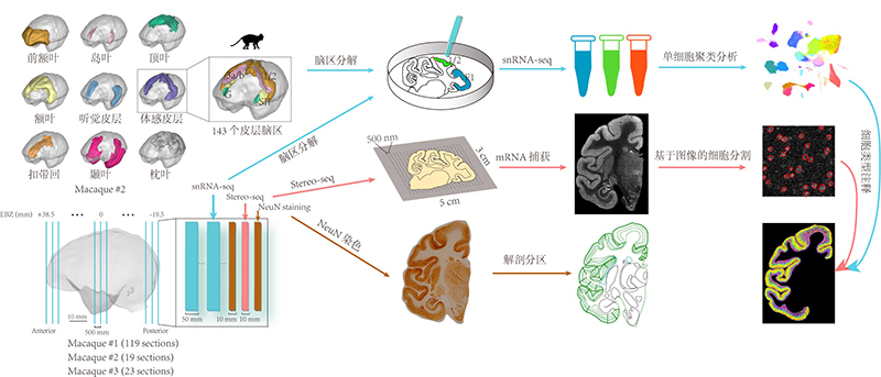 圖1. 總體實驗設計。利用Stereo-seq技術采集了3只獼猴左半腦的161張厚度為10微米切片的空間轉錄組數據。同時利用顯微切割結合單細胞核轉錄組測序技術了獲得了百萬級別的獼猴大腦皮層單細胞核轉錄組數據。通過單細胞核轉錄組和空間轉錄組整合分析,繪制了食蟹猴大腦全皮層的三維單細胞空間分布圖譜。