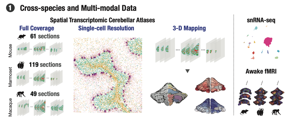 9月27日,?Science期刊在線發(fā)表了題為“Cross-species single-cell spatial transcriptomic atlases of the cerebellar cortex?” 的研究論文,該研究成果由中國(guó)科學(xué)院腦科學(xué)與智能技術(shù)卓越創(chuàng)新中心(神經(jīng)科學(xué)研究所)聯(lián)合杭州華大生命科學(xué)研究院、上海腦科學(xué)與類腦研究中心、中國(guó)科學(xué)院遺傳進(jìn)化與動(dòng)物模型重點(diǎn)實(shí)驗(yàn)室、臨港實(shí)驗(yàn)室、華南理工大學(xué)、騰訊AI Lab等單位80多人的科研團(tuán)隊(duì)合作完成。