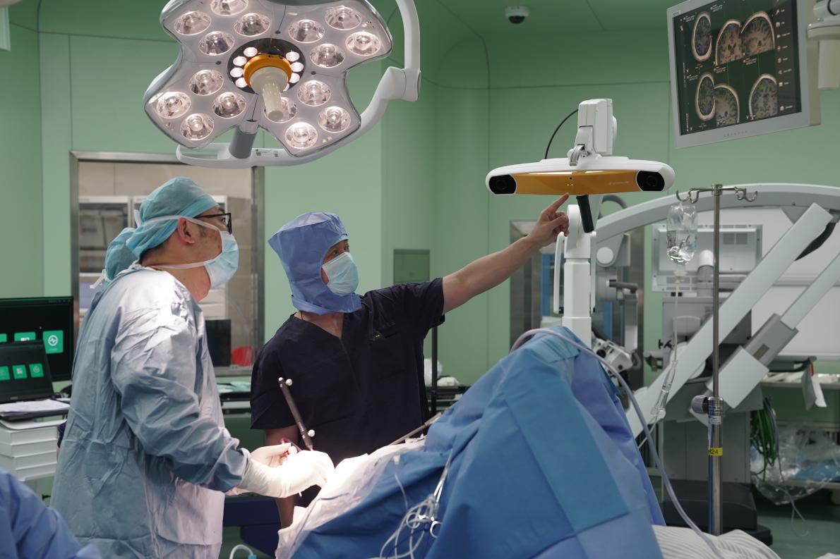 中國首例無線侵入式腦機接口系統前瞻性臨床試驗手術現場,華山醫院吳勁松教授與路俊鋒教授做討論