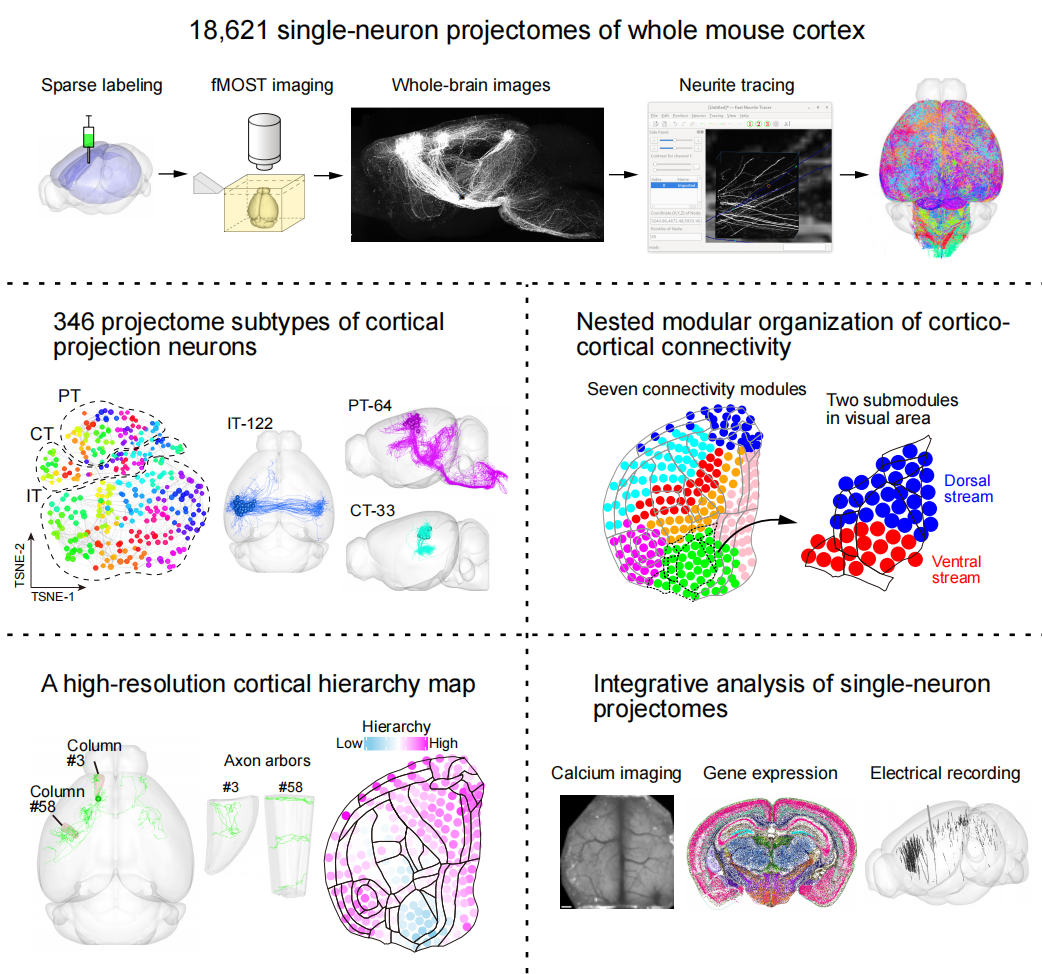 在哺乳動物中,大腦皮層負責(zé)包括感覺運動轉(zhuǎn)化和認知抉擇等在內(nèi)的高級功能。解析皮層神經(jīng)元的全腦聯(lián)結(jié)規(guī)律對于揭示這些腦功能的神經(jīng)機制至關(guān)重要。之前人們對皮層聯(lián)結(jié)網(wǎng)絡(luò)的研究還停留在神經(jīng)元群體的水平上,但對于皮層的功能聯(lián)結(jié)是如何通過單個神經(jīng)元實現(xiàn)的,目前還不為人所知。另外,皮層神經(jīng)元的結(jié)構(gòu)聯(lián)結(jié)與其它模態(tài)數(shù)據(jù),包括空間轉(zhuǎn)錄組、鈣成像數(shù)據(jù)和電生理記錄數(shù)據(jù)之間的關(guān)系也缺乏系統(tǒng)的研究。