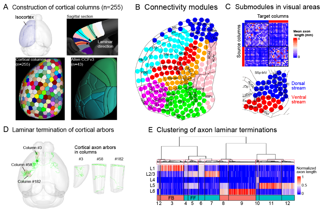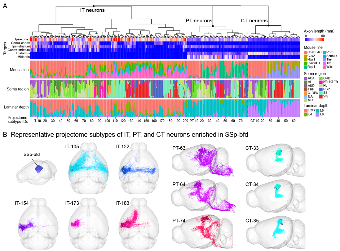 研究人員通過全腦范圍內(nèi)神經(jīng)元軸突形態(tài)的系統(tǒng)聚類,定量刻畫了單神經(jīng)元軸突形態(tài)的相似性,獲得了346個皮層神經(jīng)元投射組亞型,并系統(tǒng)地分析了這些神經(jīng)元亞型的空間分布和全腦投射(圖2),為進一步研究皮層功能提供了重要的線索。