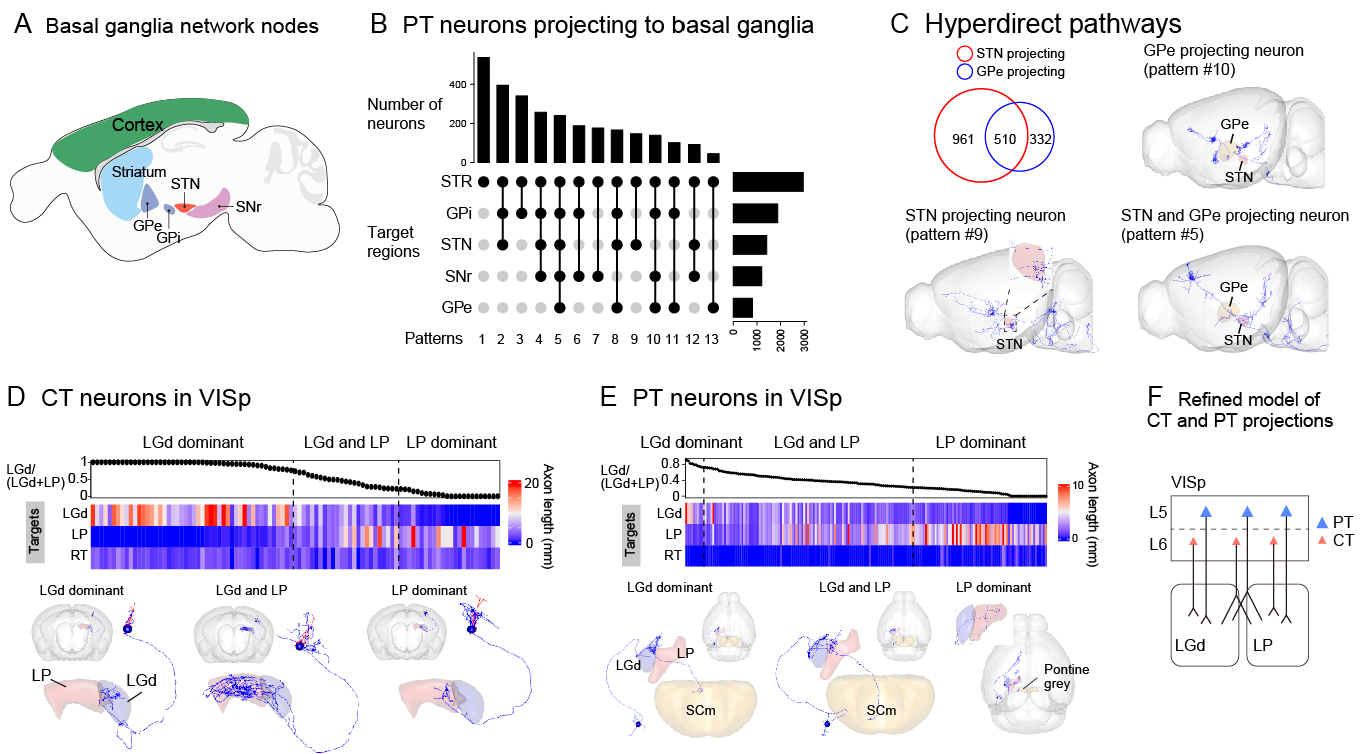 研究人員發(fā)現(xiàn)皮層錐體束(pyramidal tract, PT)神經(jīng)元到基底節(jié)腦區(qū)的投射存在多種組合模式。例如,在超直接通路(hyperdirect pathway)中,PT神經(jīng)元能夠特異地投射到丘腦底核(subthalamic nucleus,STN),或者外側(cè)蒼白球(external globus pallidus,GPe),或者同時投射到STN和GPe。進一步,研究人員發(fā)現(xiàn)在初級感覺皮層,皮層-丘腦(cortico-thalamic,CT)神經(jīng)元和PT神經(jīng)元都能投射到初級和高級丘腦核團(圖4)。這些分析結(jié)果揭示了單神經(jīng)元水平皮層投射的復(fù)雜性,修正了傳統(tǒng)的皮層神經(jīng)元投射模型。