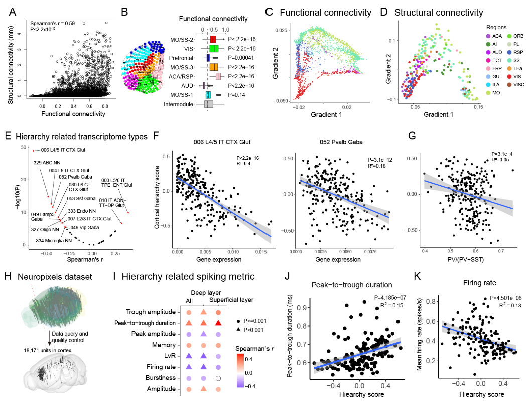 通過多模態(tài)數(shù)據(jù)整合,研究人員發(fā)現(xiàn)結(jié)構(gòu)聯(lián)結(jié)強的兩個皮層腦區(qū),它們的鈣信號也趨于同步。在整體上,皮層內(nèi)部結(jié)構(gòu)聯(lián)結(jié)的梯度也和其功能聯(lián)結(jié)的梯度有著相似的空間分布。另外,研究人員通過探索皮層等級差異與特定轉(zhuǎn)錄組類型或者基因的關(guān)系,發(fā)現(xiàn)了一系列與皮層等級相關(guān)的轉(zhuǎn)錄組類型和基因。研究人員還發(fā)現(xiàn)皮層等級與神經(jīng)元發(fā)放頻率存在負相關(guān),即皮層腦區(qū)的等級越高,其中的神經(jīng)元發(fā)放頻率越低,提示高等級腦區(qū)的神經(jīng)元更多地參與信息的整合(圖5)。