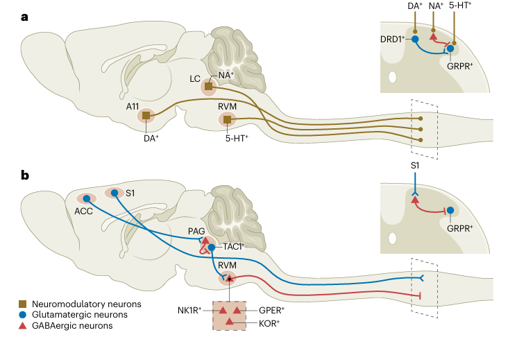 1.脊髓層面的癢覺信息處理與門控:脊髓背角存在處理化學性癢與機械性癢的微環路。脊髓背角中,表達胃泌素釋放肽受體的神經元是化學性癢信號處理的關鍵節點;而表達UCN3、神經肽Y1受體等的興奮性中間神經元群體則特異性介導機械性癢。這些通路的活動受到多種抑制性神經元(如表達神經肽Y、甘丙肽或強啡肽的GABA能神經元)的精密門控,其功能失調是導致自發癢和癢覺超敏的重要機制。